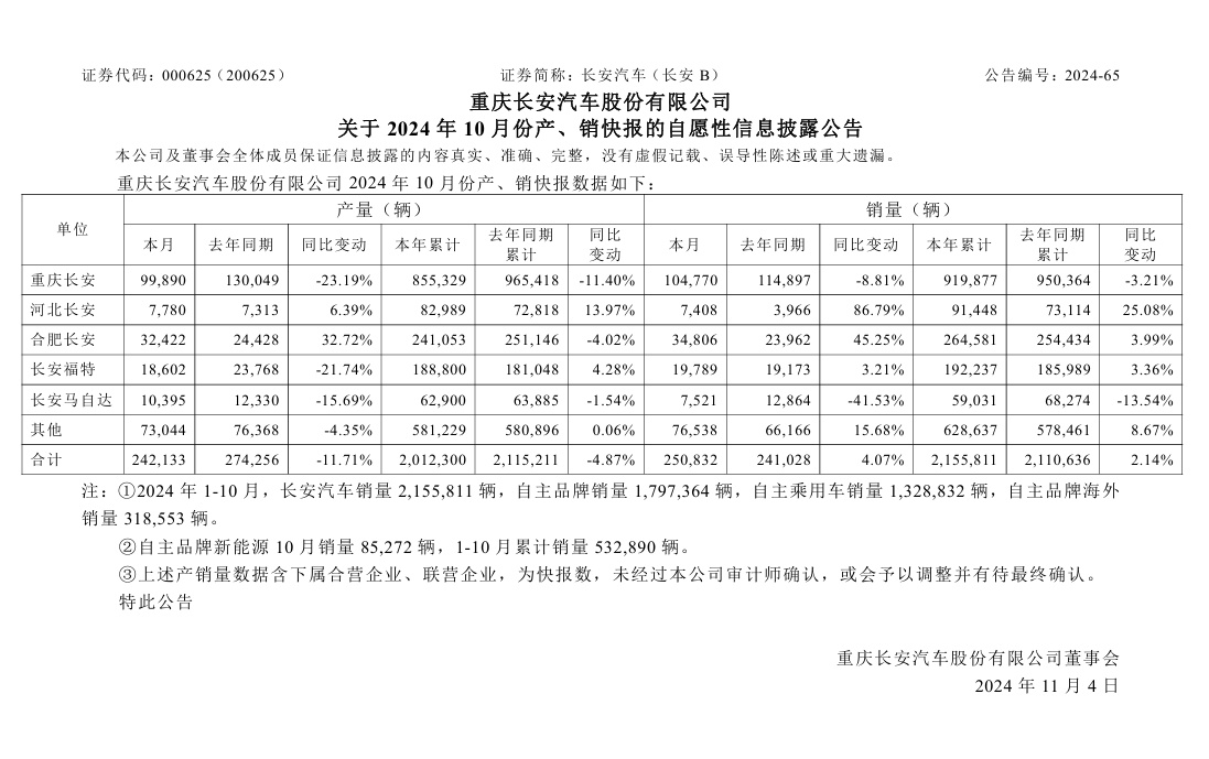 公告显示,2024 年 1-10 月,长安汽车销量 2,155,811 辆,自主品牌销量 1,797,364 辆,自主乘用车销量 1,328,832 辆,自主品牌海外销量 318,553 辆。