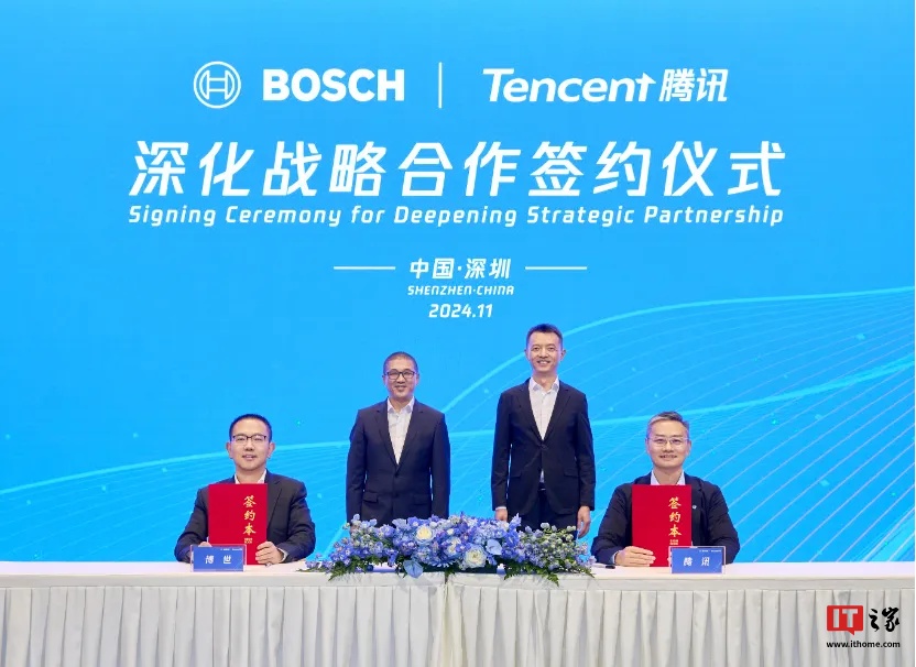 IT之家 11 月 4 日消息,腾讯宣布与汽车技术与服务供应商博世签订新一轮的战略合作备忘录,双方将在公有云、自动驾驶专有云、自动驾驶地图、智能座舱、大模型底座、智能化方案国际化拓展等方面继续深化合作。