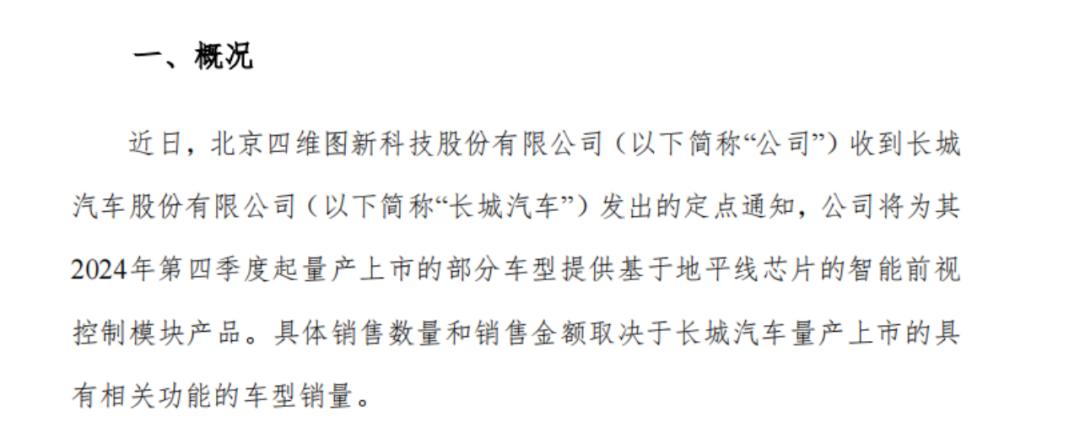 如9月份四维图新收到长城汽车定点通知,将为长城汽车的部分车型供应基于地平线芯片的智能前视控制模块产品,这些车型将于2024年第四季度开始量产并投放市场。具体的销量和收入将取决于配备这些功能的型号的销售情况。