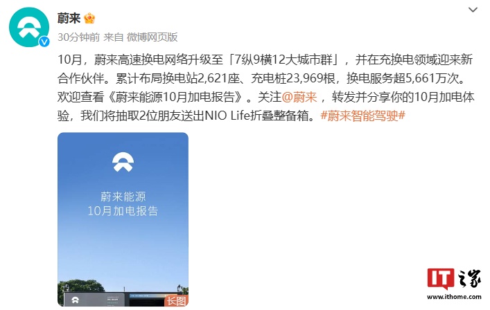 IT之家 11 月 4 日消息,蔚来今日发布 10 月加电报告,本月蔚来高速换电网络升级至「7 纵 9 横 12 大城市群」,“换电县县通计划”新增覆盖 12 个县级行政区。