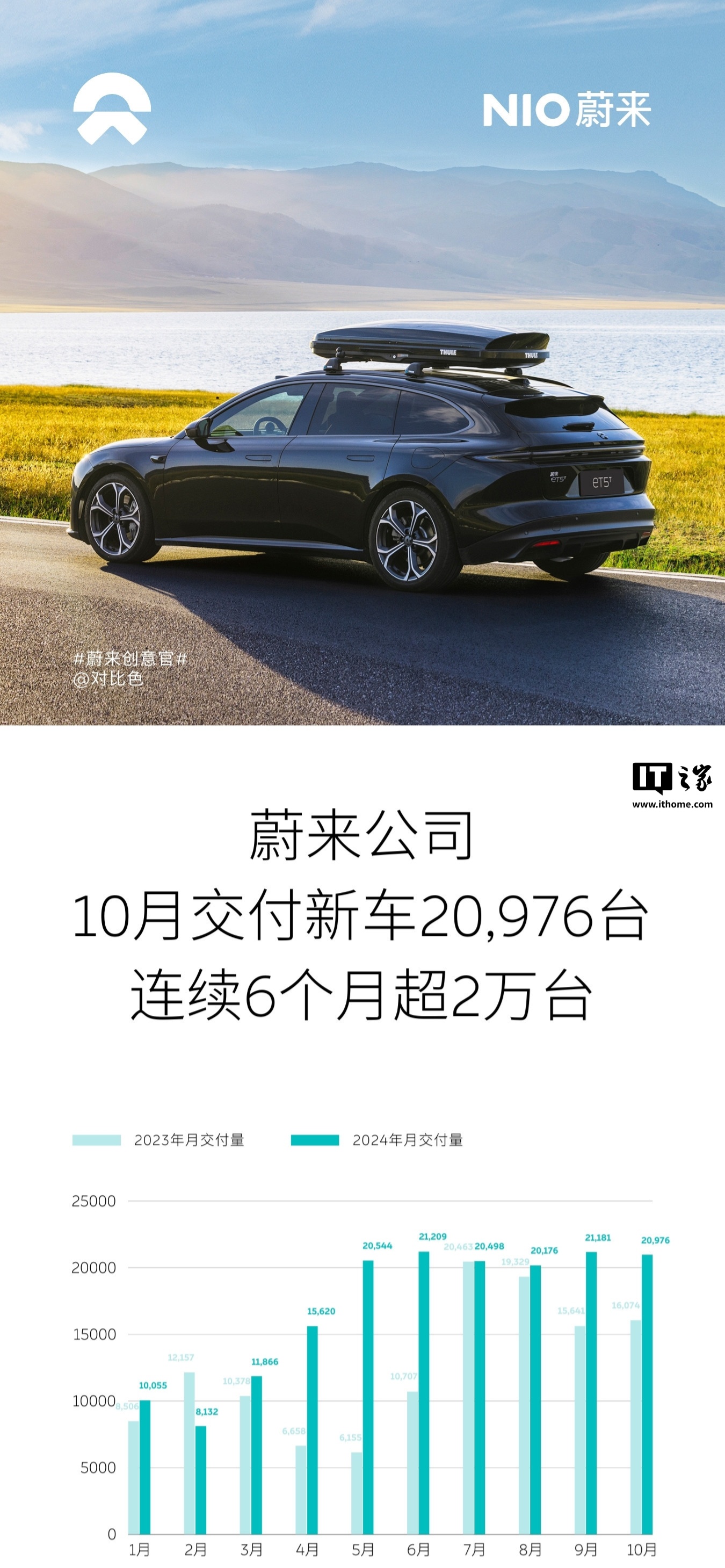 IT之家此前报道,蔚来 10 月交付 20976 辆汽车,同比增长 30.5%,连续 6 个月超 2 万台。其中蔚来品牌 16657 辆,乐道 4319 辆。截至 2024 年 10 月 31 日,蔚来累计交付量超 61.9 万辆(619,851 辆)。