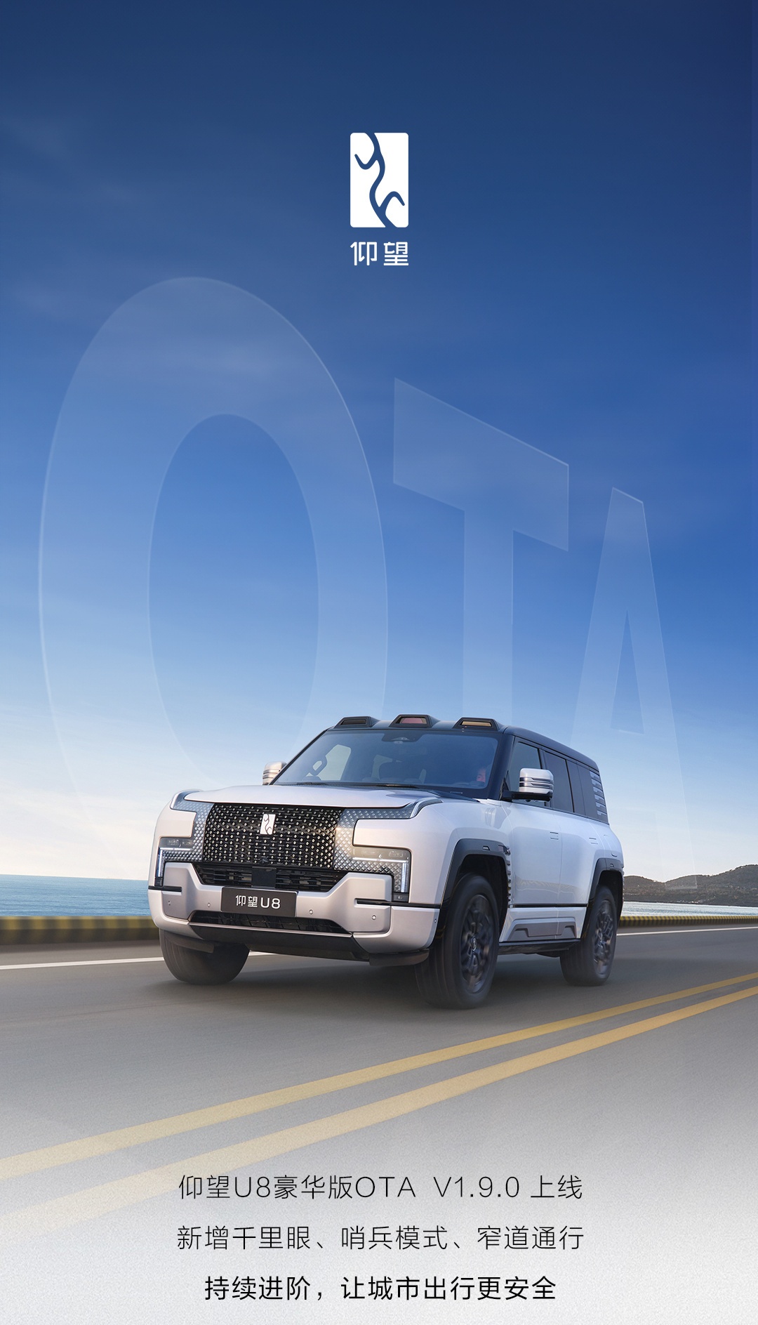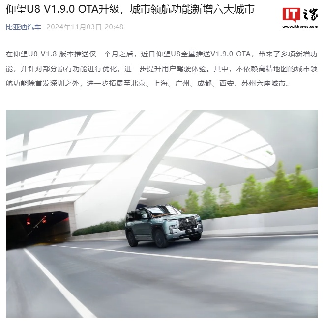 IT之家 11 月 4 日消息,比亚迪昨日发文宣布,旗下仰望 U8 汽车近日全量推送 V1.9.0 版本 OTA 升级,支持千里眼、高德绿灯倒计时等功能,同时城市领航辅助新增六大城市。