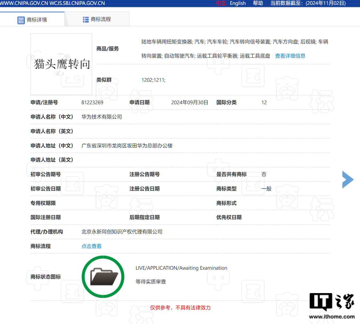 IT之家 11 月 4 日消息,IT之家从国家知识产权局商标局官网获悉,华为技术有限公司申请注册“猫头鹰转向”“鸿蒙智行猫头鹰”等商标,国际分类为运输工具、科学仪器,当前商标状态均为等待实质审查。