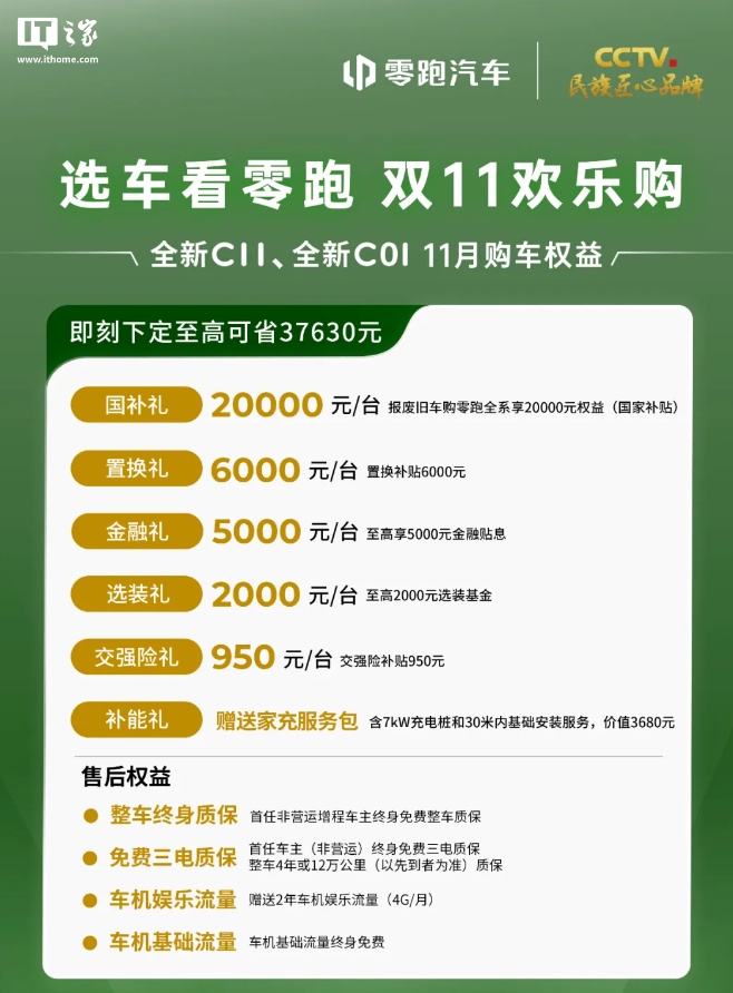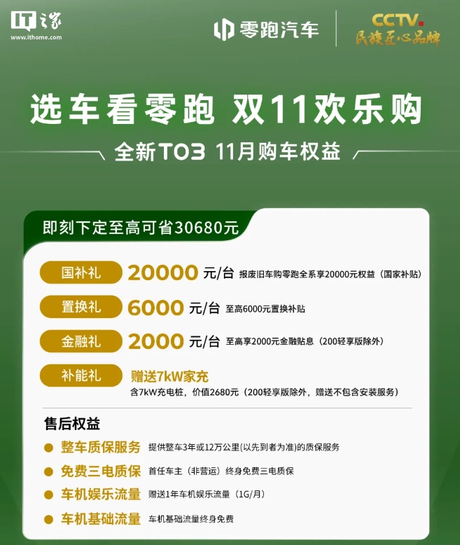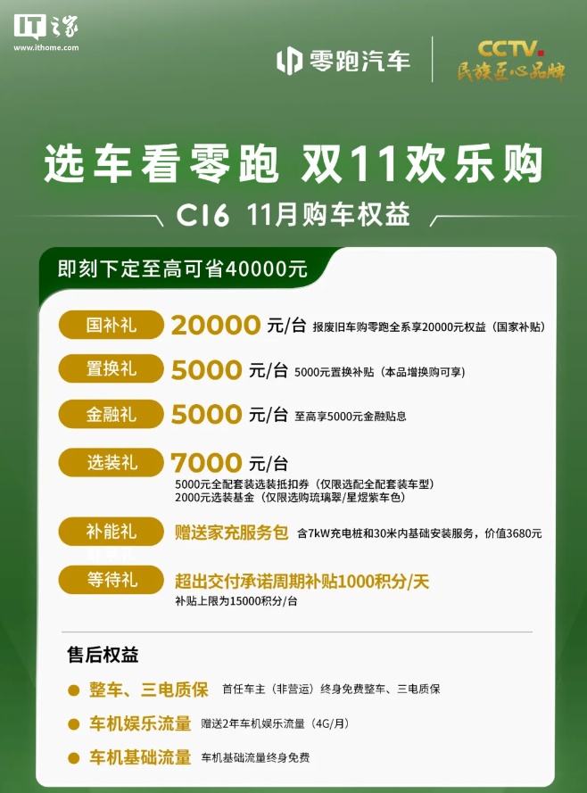IT之家 11 月 4 日消息,零跑汽车 11 月 2 日公布全新购车权益,即日起至 11 月 30 日(含)通过零跑官方渠道缴纳 5000 元定金的用户可享,涉及车型包含零跑 C16、C10、C11、C01、T03。IT之家整理如下: