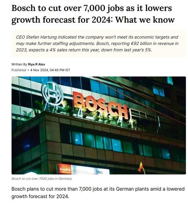 前不久博世集团CEO公开表示:“2024年将比预期的更加困难,2025年可能也是如此,我们将无法避免裁员。”