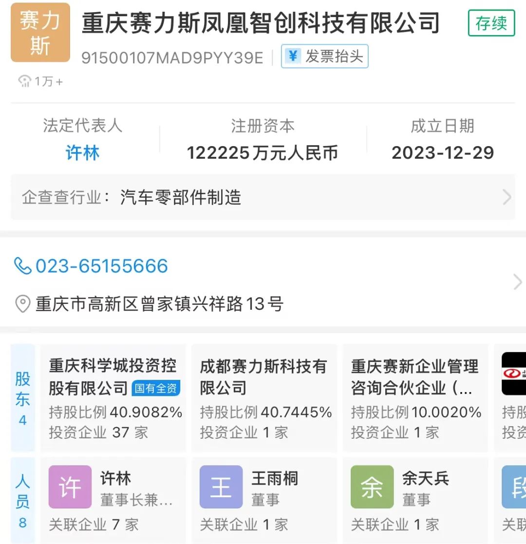 根据企查查的信息显示:凤凰创智注册资本为12.22亿,目前有四个股东,分别是国有全资的重庆科学城投资控股有限公司(40.9082%)、成都赛力斯科技有限公司(40.7445%)、重庆赛力斯企业管理咨询合伙企业(有限合伙)(10.00020%)、重庆赛力斯新能源汽车设计院有限公司(8.3453%)。
