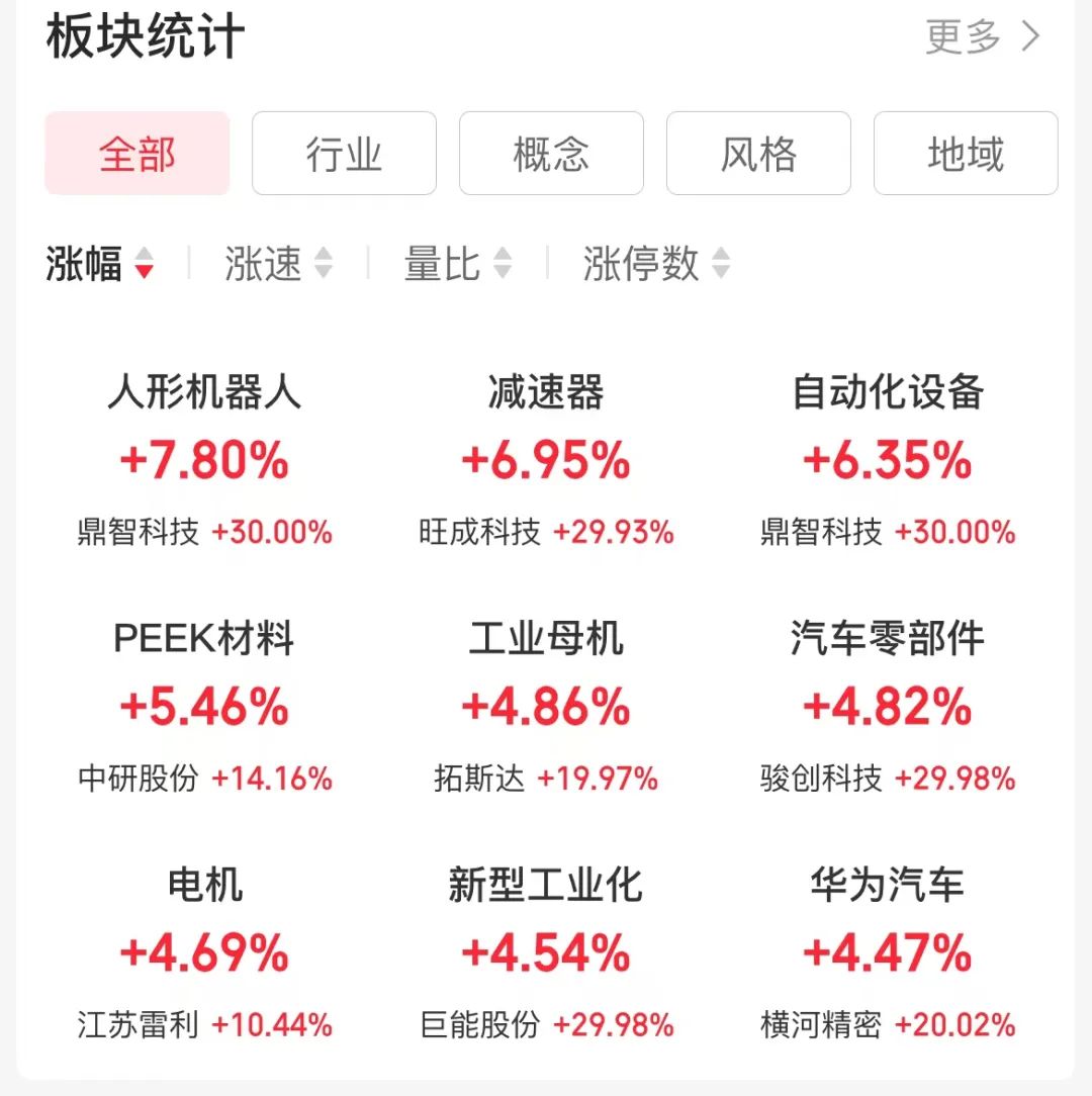赛力斯的这份如此不严谨的“声明”,会不会给资本爆炒机器人降降温呢?因为今天人形机器人板块概念板块成为今天A股涨幅最大的概念板块,人形机器人核心零部件减速器板块涨幅第二。