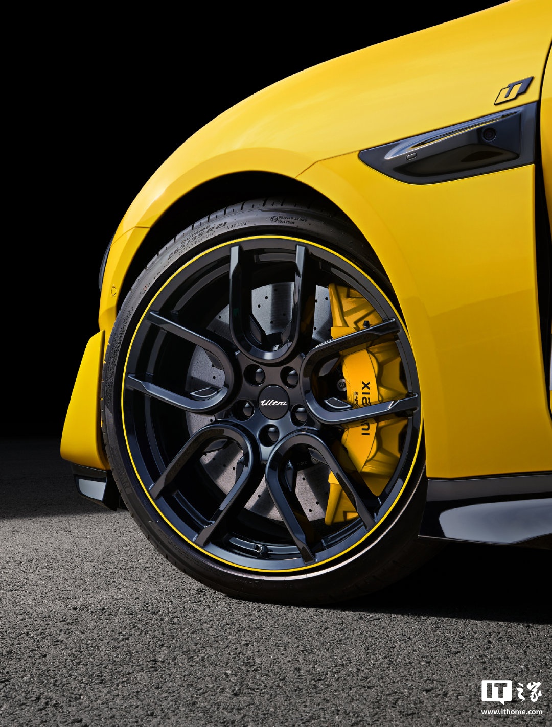 在 10 月 29 日发布会上,小米 SU7 Ultra 首次展示了 21 英寸轮毂,设计感别具一格,它由 5 个“U”构成,凸显专属感;外侧搭配纤细的黄色外圈,尽显性能。