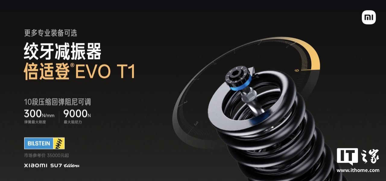 小米 SU7 Ultra 提供全新定制的 EVO T1 绞牙减振器套装可选,结构与市售版不同:前弹簧刚度达到 300N / mm(是 Max 车型前空气弹簧刚度的 5 倍),减振器的最大阻尼力 9000N