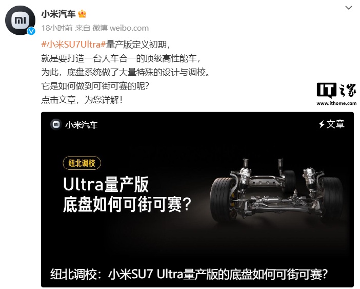 IT之家 11 月 6 日消息,小米 SU7 Ultra 量产车于 10 月 29 日开启小定,将于 2025 年 3 月正式发布,预售价 81.49 万元。小米汽车官方昨日发文对 SU7 Ultra 量产版车型底盘系统进行介绍。