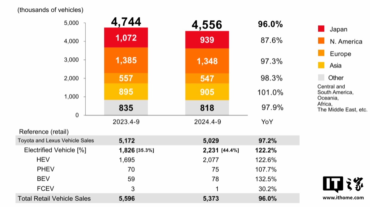 汽车销量方面,丰田汽车 2025 财年上半年(2024 年 4~9 月)全球销量为 455.6 万辆,同比下降 4%;包含丰田和雷克萨斯等品牌的总零售量为 537.3 万辆。