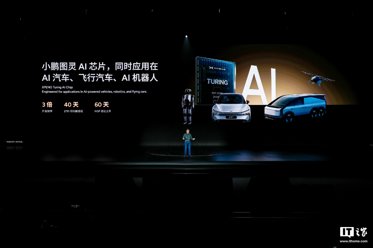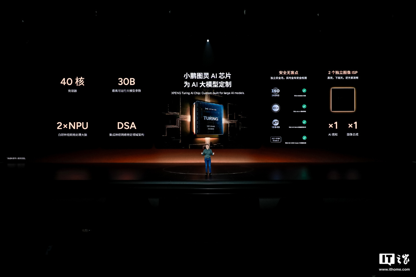 小鹏还发布了图灵 AI 芯片,其拥有 40 核处理器,可本地运行 30B 参数的大模型,集成 2 个 NPU 以及面向神经网络的特定领域架构。在该芯片的加持下,车辆能够通过 2 个独立图像 ISP 应对黑夜、下雨天、逆光等光线不足情况,感知更清晰。此外,该芯片通用于 AI 机器人、AI 汽车、飞行汽车,号称“一颗顶三颗”,自动驾驶、智能座舱大模型都可驱动。