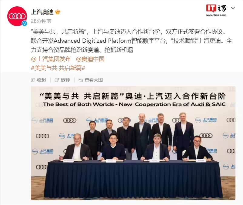 据IT之家此前报道,今年 5 月 20 日,上汽集团和奥迪汽车联合宣布签订合作协议,共同为上汽奥迪开发多款高端智能电动车,首款产品预计将于 2025 年正式上市。