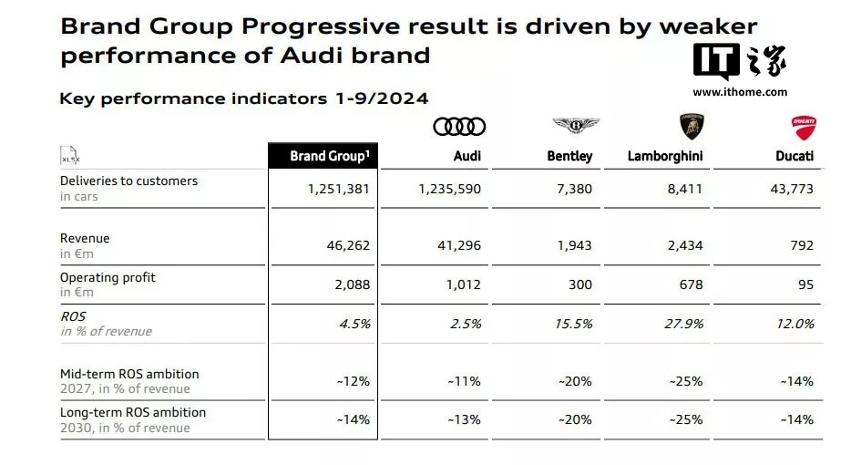 IT之家 11 月 6 日消息,德国汽车巨头奥迪集团发布了表现不佳的第三季度财报。尽管大众集团的困境广为人知,但奥迪集团同样面临着严峻的市场挑战、激烈的竞争以及零部件供应短缺等问题。这些因素共同导致了奥迪、宾利和兰博基尼品牌在今年前九个月的销量同比下降了 10.9%。