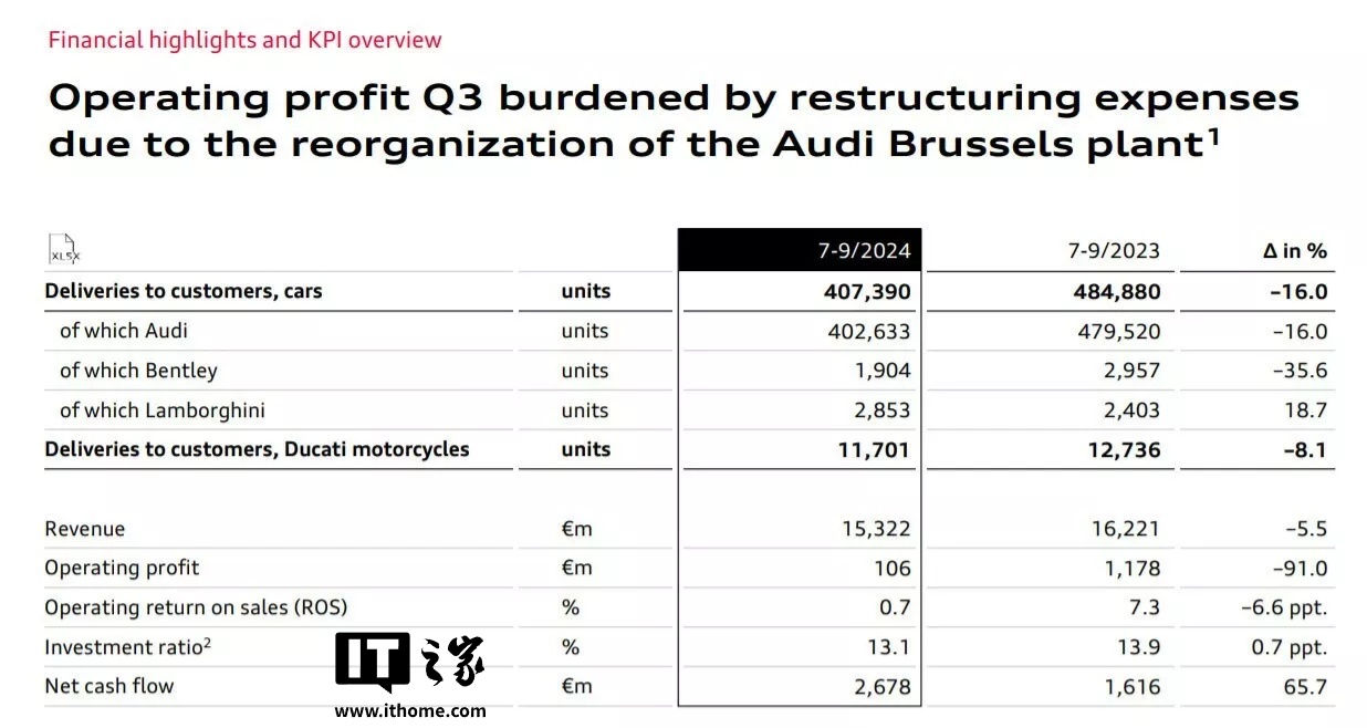 IT之家注意到,第三季度奥迪集团共交付 407390 辆汽车,同比下降 16%。营收 153.22 亿欧元,同比下降 5.5%。营业利润同比暴跌了 91%,降至 1.06 亿欧元,该公司将这一大幅下滑主要归咎于“奥迪布鲁塞尔工厂重组的重组费用”。