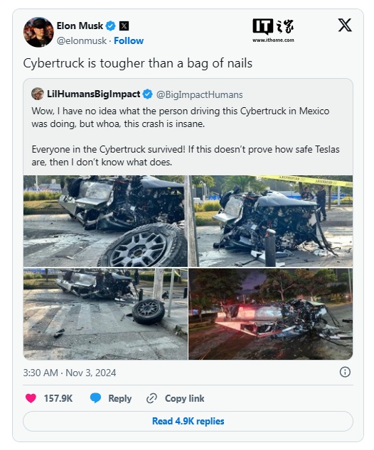 特斯拉 CEO 埃隆・马斯克也在社交媒体上分享了事故照片,并表示“Cybertruck 比一袋钉子还坚固”。