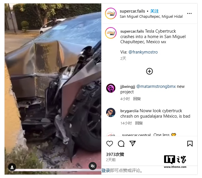 IT之家注意到,这并不是近期墨西哥发生的唯一一起 Cybertruck 事故。就在几天前,另一辆 Cybertruck 在墨西哥圣米格尔・查普尔特佩克撞上一堵墙,车头严重变形,幸运的是驾驶员并无大碍。