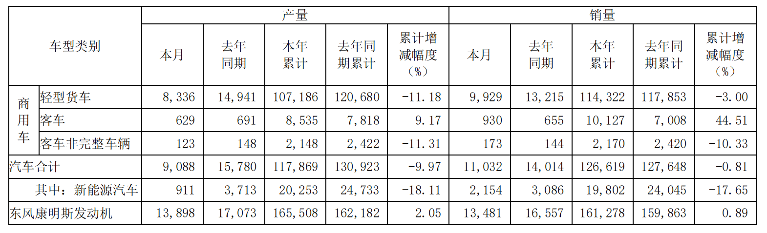 11月6日,东风股份发布10月产销数据快报称,该月合计生产汽车9088辆,低于去年同期的15780辆;今年累计生产汽车117869辆,较去年同期的130923辆减少了9.97%。10月销售汽车11032辆,低于去年同期的14014辆;今年累计销售汽车126619辆,较去年同期的127648辆减少了0.81%。