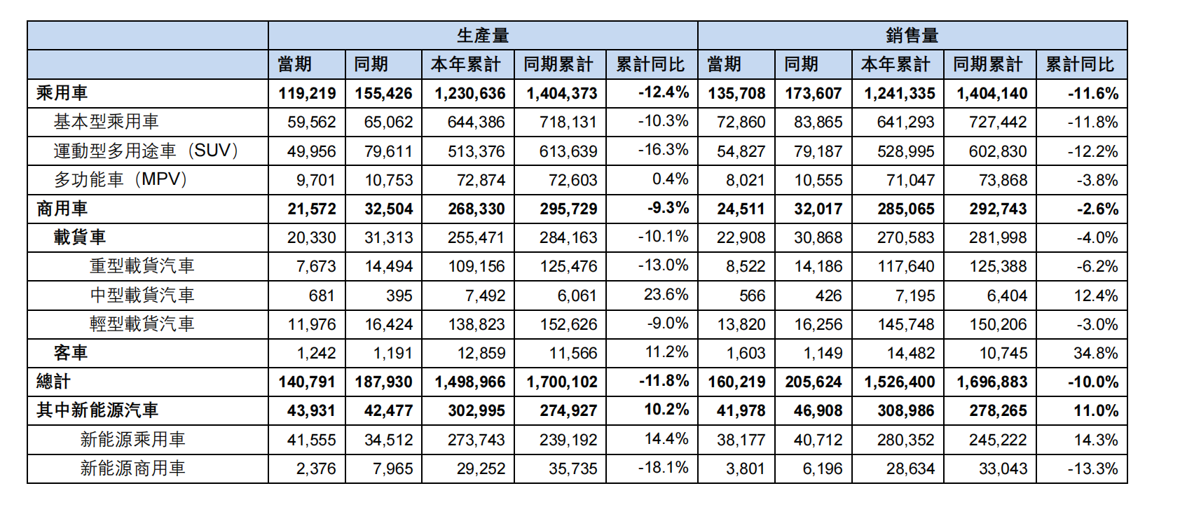 另外,10月生产新能源汽车43,931辆,比去年同期的42,477辆有所增加,销售新能源汽车41,978辆,不及去年同期的46,908辆。