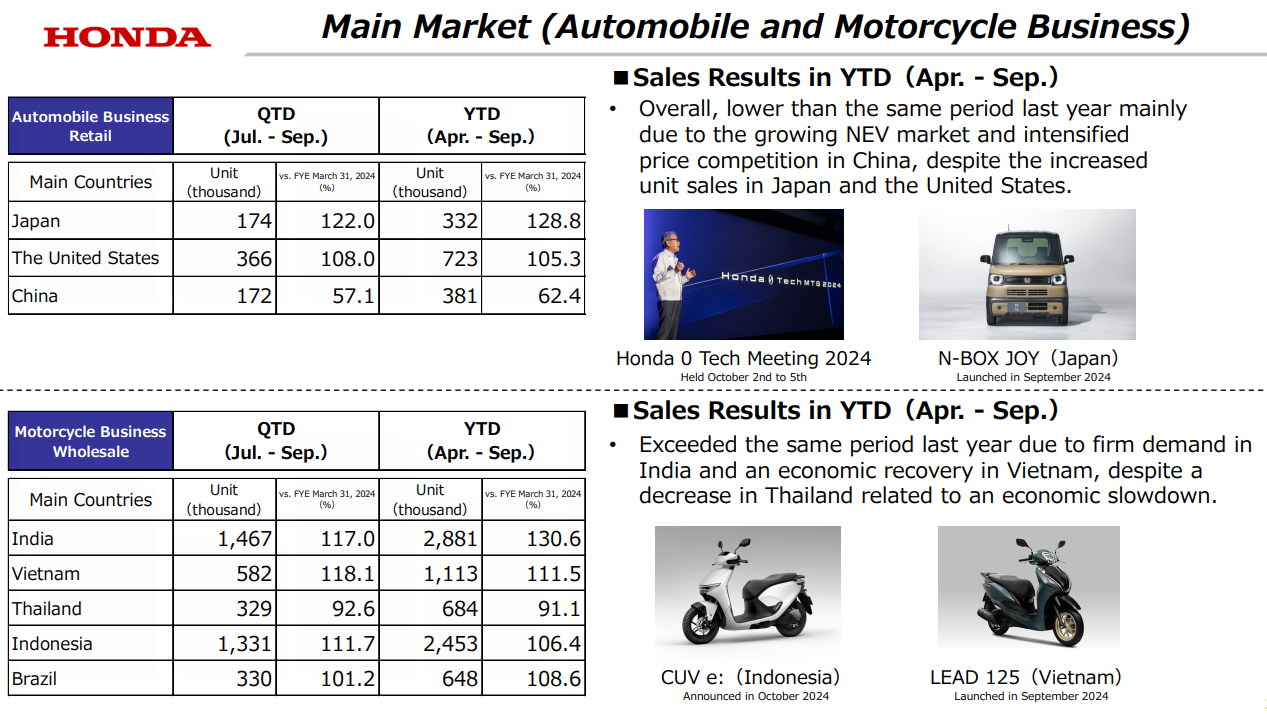 本田表示,第二财季的销售业绩低于去年同期,主要是由于东南亚和中国市场的压力抵消了美国和日本市场较高的汽车销量。