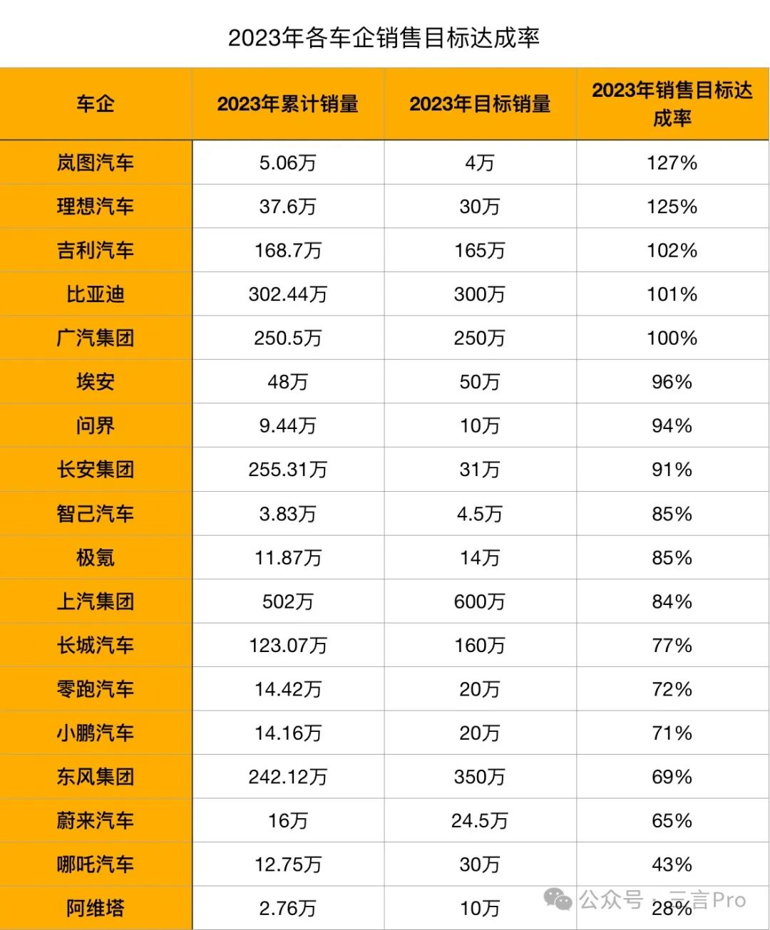 对比2023年车企销量目标完成度来看,今年广汽和埃安“掉队”,哪吒、阿维塔位置基本没变化,处于“垫底”。
