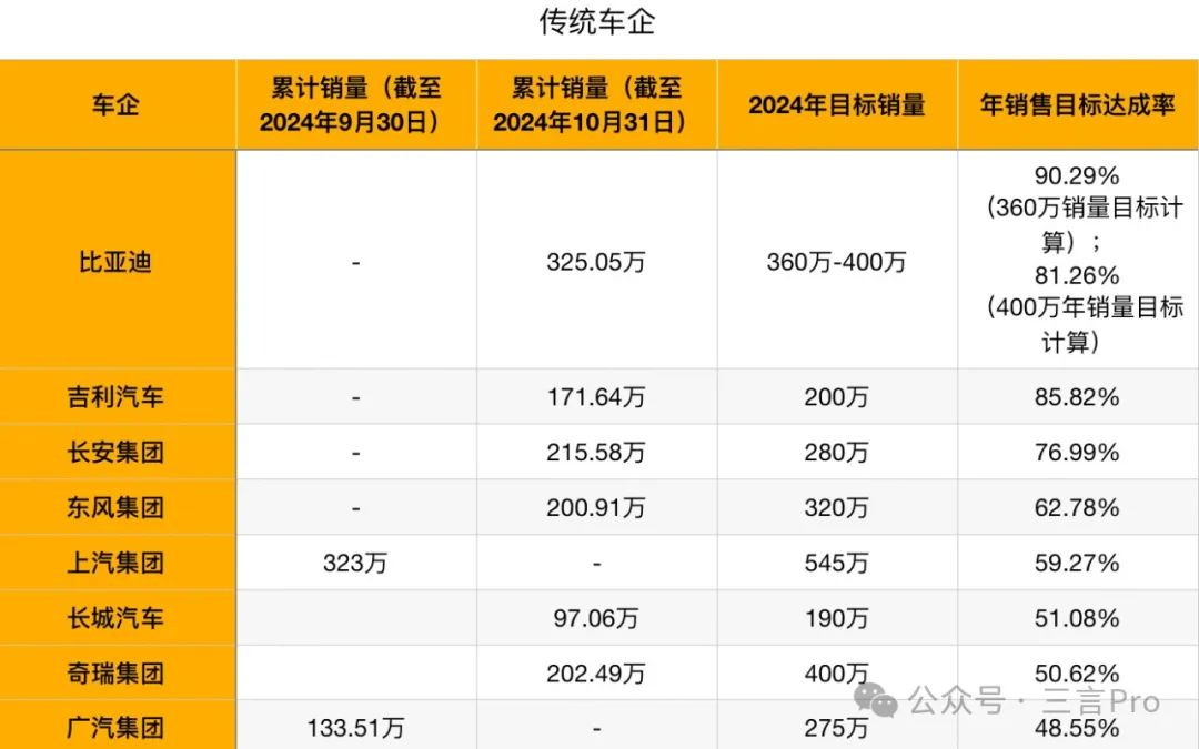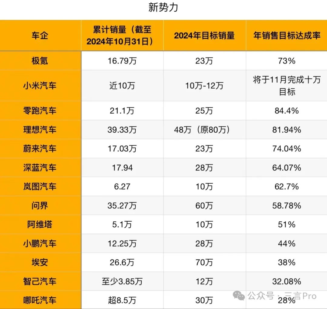 时间过的真快,2024即将结束。差不多5个月前,三言曾统计过国内各车企销量目标完成情况,当时无论是传统车企还是造车新势力,年销售目标达成率都不高。只有少数车企达成率超过四成;绝大多数车企达成率在25%上下。