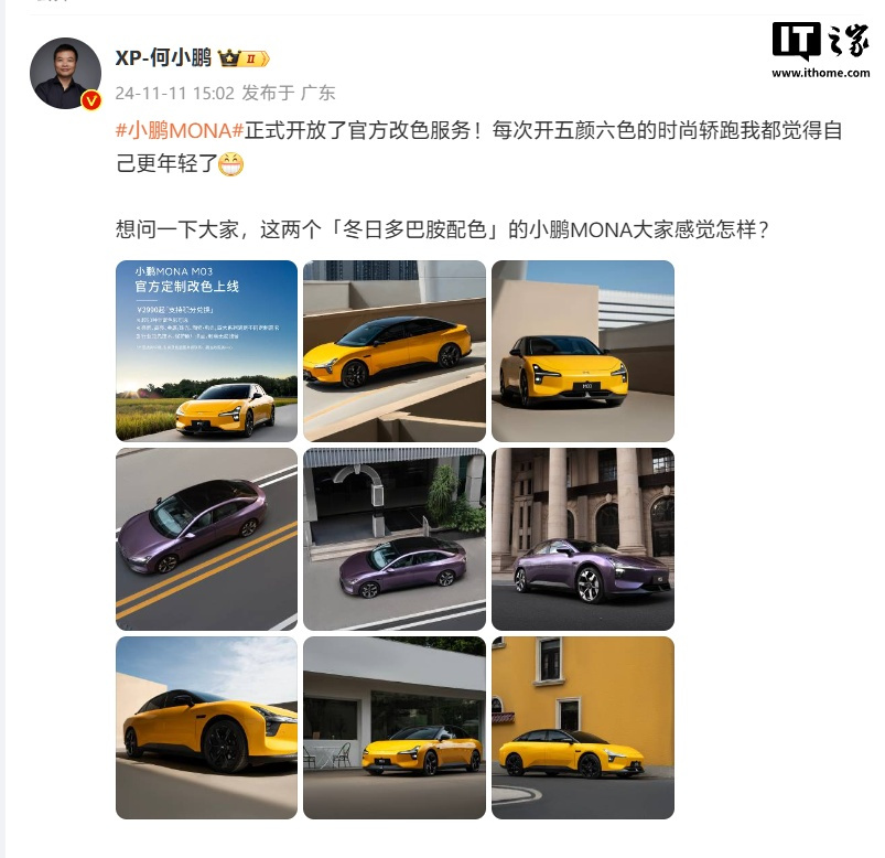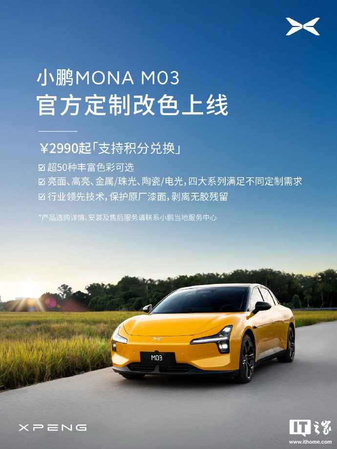 IT之家 11 月 11 日消息,小鹏汽车董事长何小鹏今天发文宣布,小鹏 MONA M03 官方定制改色服务正式上线,价格为 2990 元起,支持积分兑换。