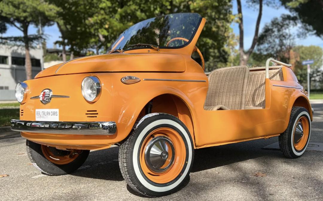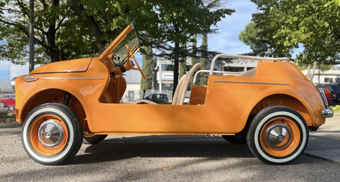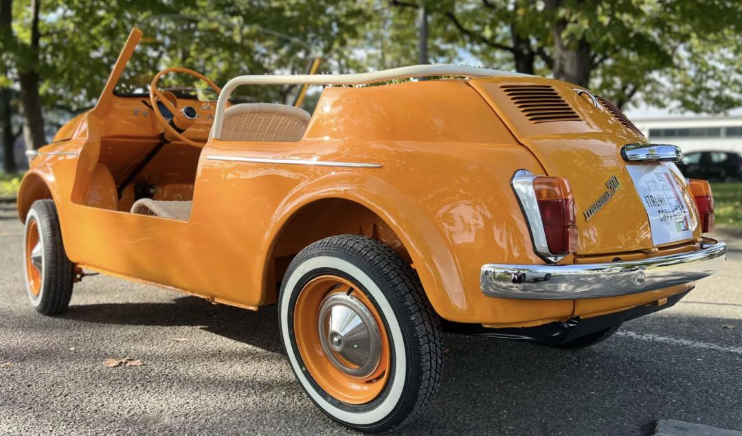 这是一款特别的菲亚特 500 “Marina”,它没有过多装饰、车顶、部分车门、支柱,而且是电动的(没有内燃机)。这是 Real Italian Cars 的最新项目,500 Jolly 的传动系统被拆除,换成了来自日本供应商的防水电池和电动机。电池续航 155 英里(250 公里),电动机功率为 31.5 千瓦(约 42 马力)。