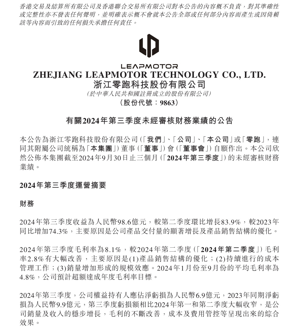 IT之家 11 月 11 日消息,零跑汽车今日公告,2024 年第三季度收益为人民币 98.6 亿元,环比增长 83.9%,同比增长 74.3%。
