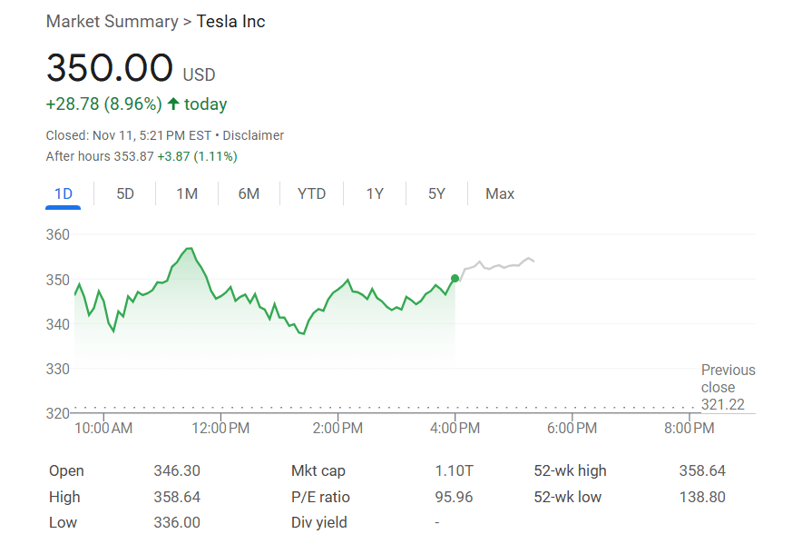 特朗普赢得美国总统大选以来,“头号功臣”马斯克旗下的特斯拉每个交易日都在上涨。周一,特斯拉股价收涨近9%,收报350美元,盘中最高达到358.64美元。特斯拉创下最近四年来最大的五天累计涨幅。