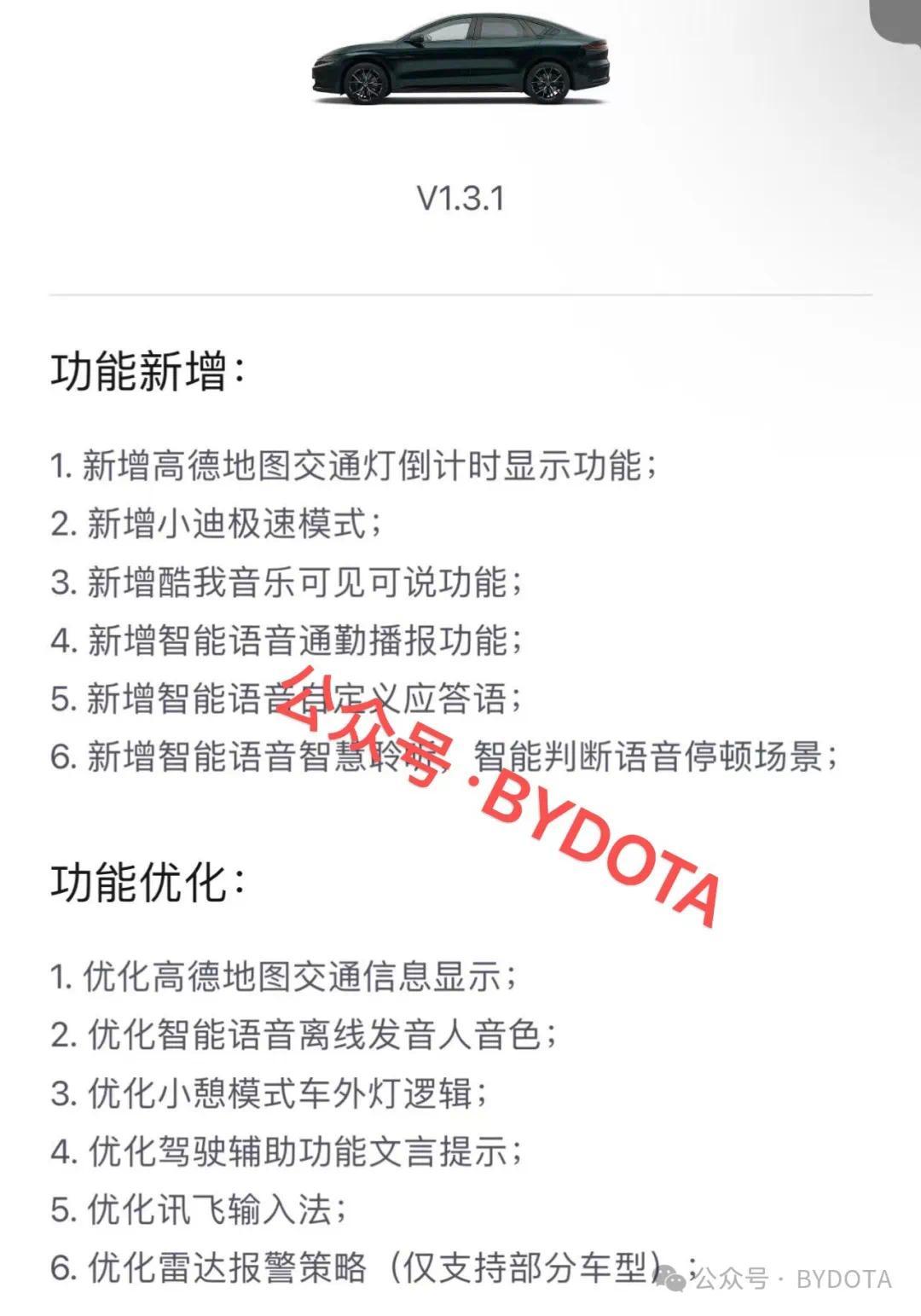 凤凰网科技讯 11月12日,据BYDOTA报道,今日比亚迪面向汉家族大量车型推送1.3.1 OTA更新,主要新增高德地图交通灯倒计时、小迪极速模式等6项功能及6项优化。本次推送涉及车型:汉DM-i/EV荣耀版全系、汉DM-i、汉EV创世版、汉DM-i冠军版、汉EV冠军版、汉EV千山翠限量版、汉DM-p、汉DM-p战神版全系。