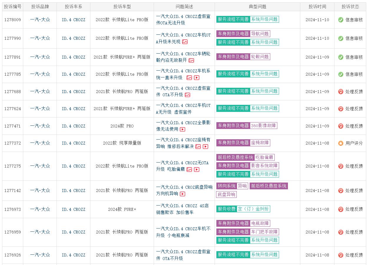 最近,一汽大众ID.4 CROZZ遭到了车主们的集体投诉,车质网显示,投诉原因普遍为“OTA不升级,虚假宣传”。
