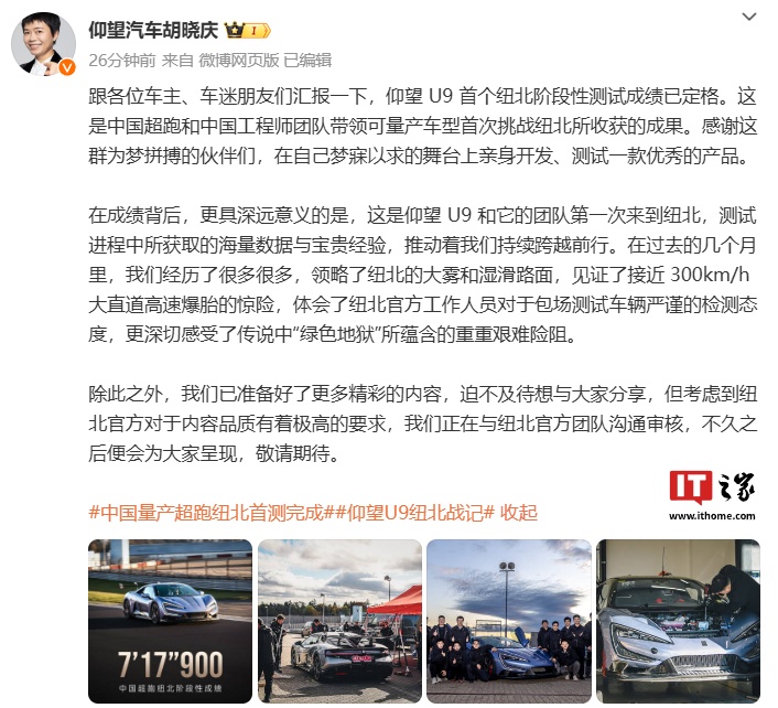 IT之家 11 月 12 日消息,仰望销售事业部总经理胡晓庆今日发布仰望 U9 首个纽北阶段性测试成绩:7 分 17 秒 900。据介绍,这是比亚迪中国超跑和中国工程师团队带领可量产车型首次挑战纽北所收获的成果。