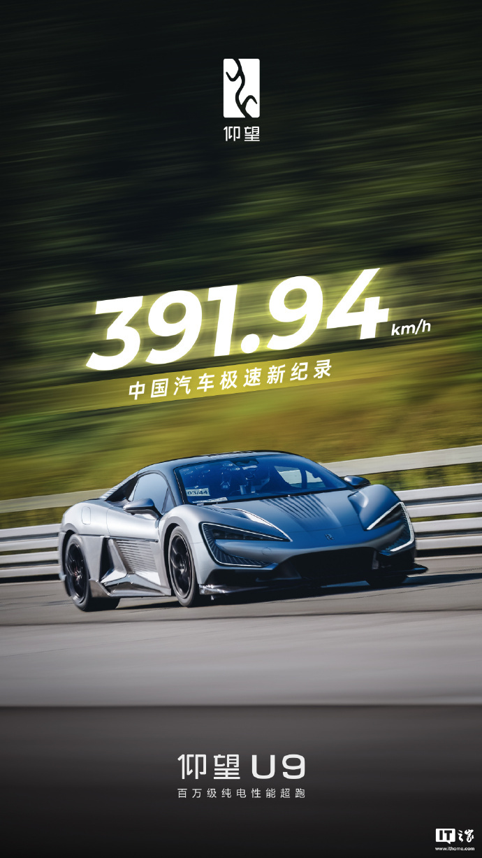 据IT之家此前报道,比亚迪旗下仰望汽车在今年 11 月 7 日公布了纯电超跑仰望 U9 的极速阶段性成绩 ——391.94km/h,并宣布创下了中国汽车极速新纪录。