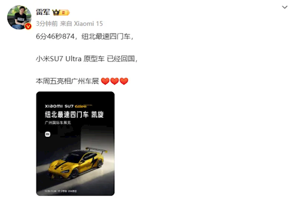快科技11月12日消息,雷军在微博宣布,小米SU7 Ultra原型车已经回国,并将于广州车展上正式亮相。