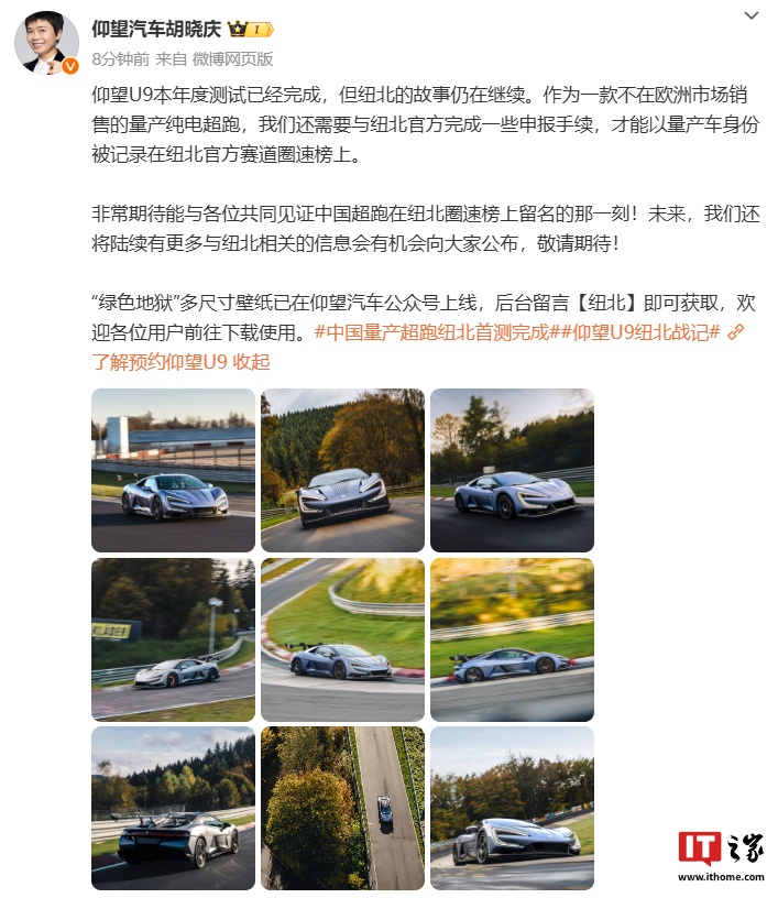 仰望销售事业部总经理胡晓庆今日就仰望 U9 超跑的纽北成绩暂未记录在官网作出解释:仰望 U9 作为一款不在欧洲市场销售的量产纯电超跑,我们还需要与纽北官方完成一些申报手续,才能以量产车身份被记录在纽北官方赛道圈速榜上。