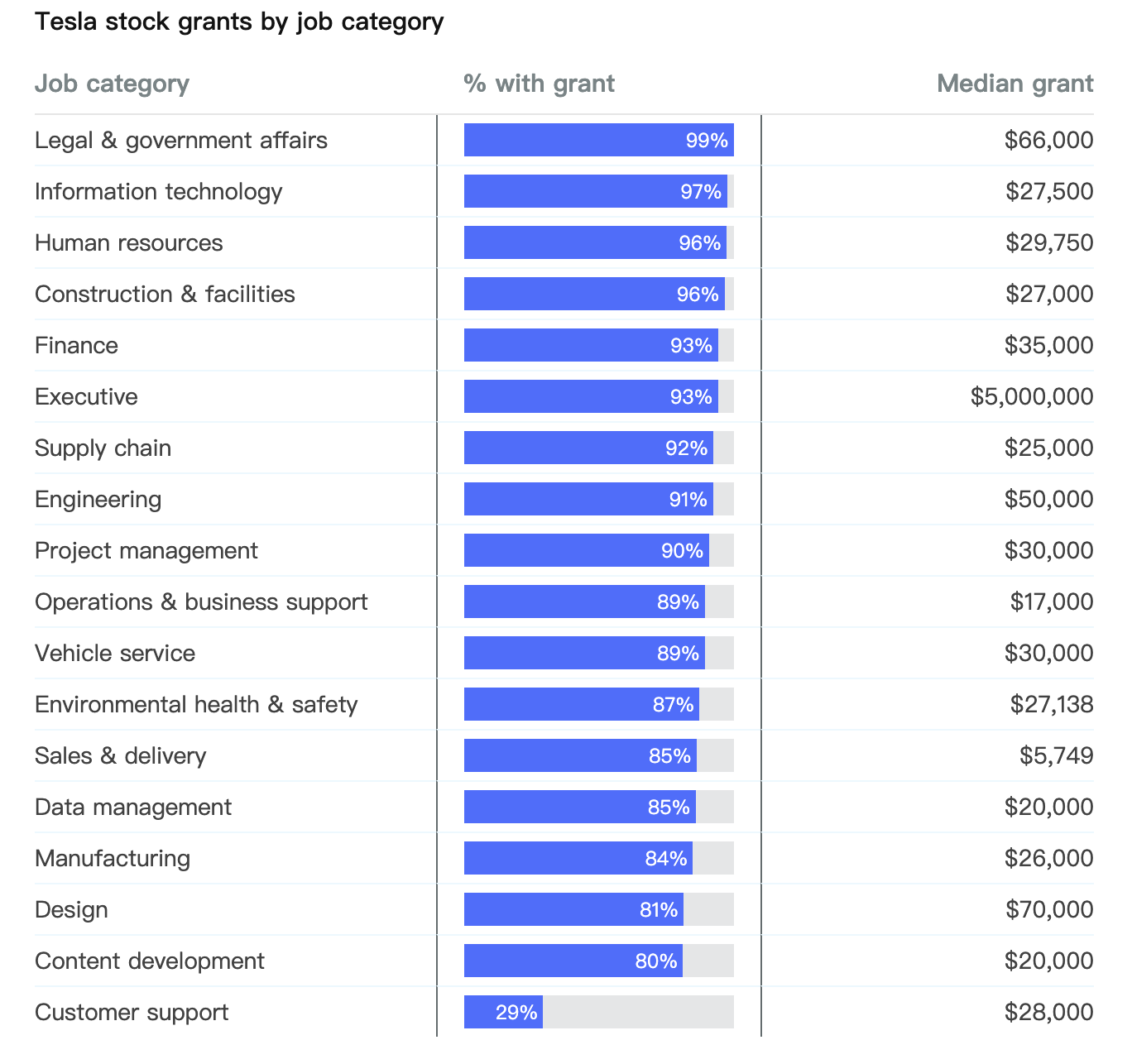 特斯拉各岗位的股票奖励中位数