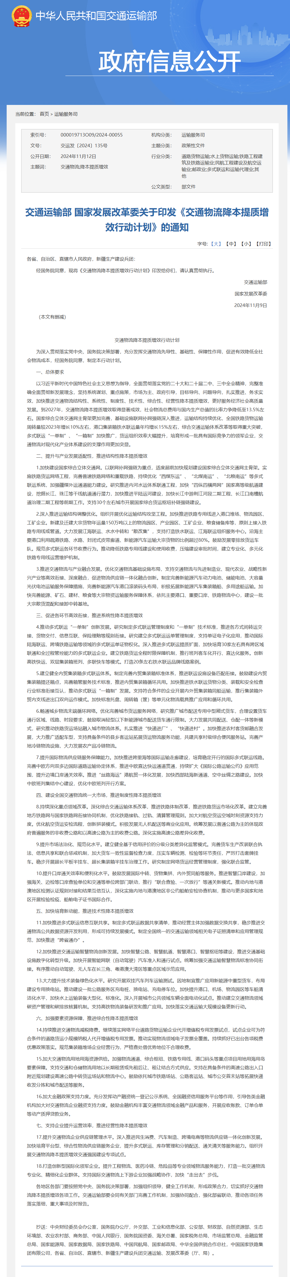 IT之家 11 月 12 日消息,今日,交通运输部、国家发展改革委发布关于印发《交通物流降本提质增效行动计划》的通知。