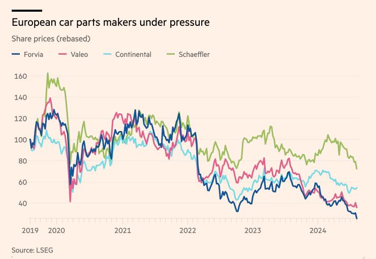 汽车业务偏低的利润率正持续拖累大陆集团的股价,尤其是2024年至今大陆集团的股价长期处在下行区间。为让核心轮胎业务更纯粹,进而吸引投资者,提升剩余部分的股票价值,大陆集团一直考虑将汽车业务从主营的轮胎业务中分离,选择“卖身”。