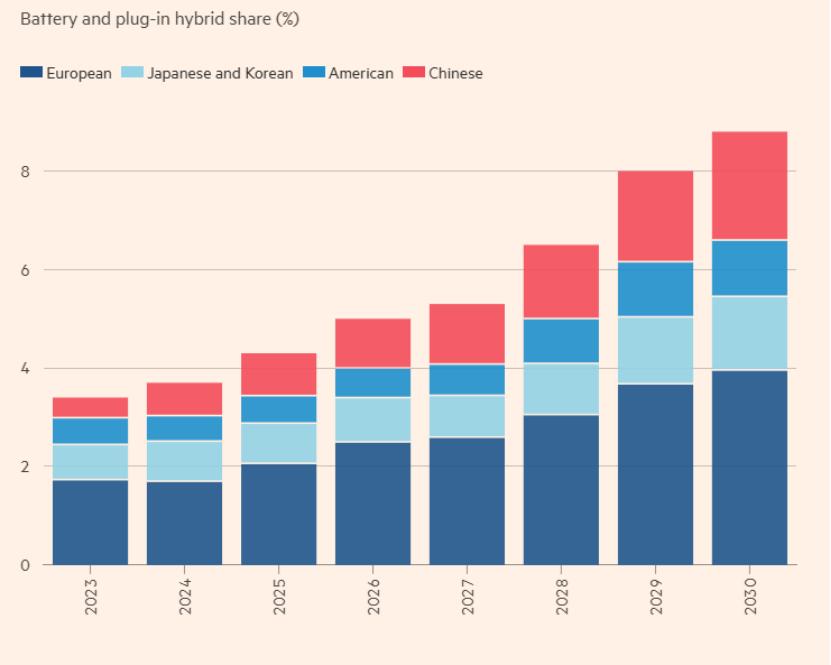 但因中国电动汽车在动力电池上更具有成本优势,塔瓦雷斯等公司表示,比亚迪、蔚来、名爵母公司上汽集团、长城汽车和奇瑞等中国制造商正制造更先进的电动汽车,其成本比欧洲汽车制造商低30%。基于此,中国汽车制造商在欧洲推出的车型售价更低,零跑、雷诺R5此前车展售价分别为2万欧元和2.5万欧元。