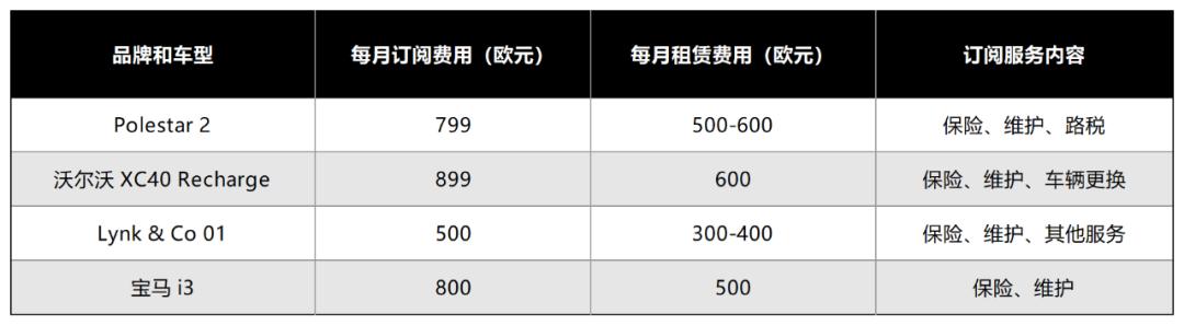 主机厂高额成本投入之下,却是订阅模式的货币化却非常困难。虽然欧洲相较于国内市场消费者更能接受订阅模式,但现阶段厂商每月高昂的订阅费用,让欧洲消费者更青睐使用租车。Polestar2、沃尔沃XC40 Recharge、领克01、宝马i3推出的订阅服务均包括保险、车辆维护等服务,但月订阅费用均大幅度高于月租赁费用。