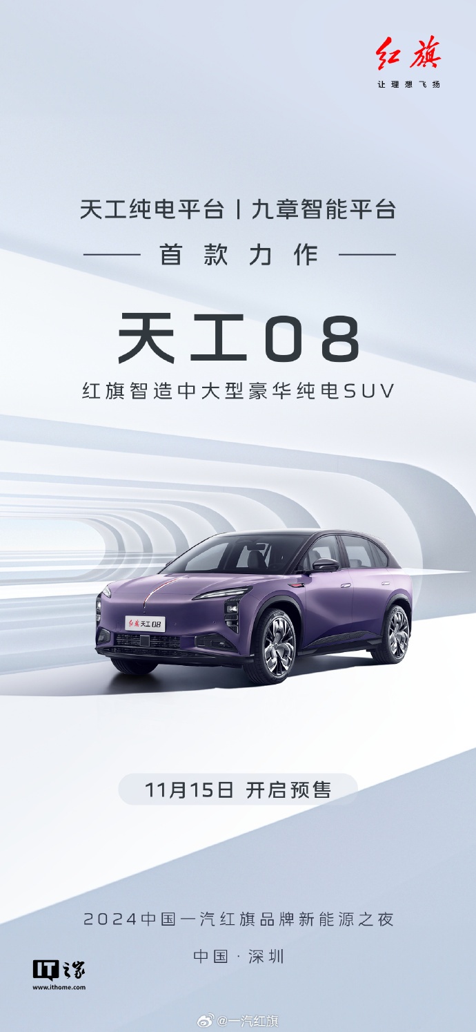 IT之家 11 月 12 日消息,今晚红旗品牌新能源之夜举行,红旗正式发布了天工纯电平台和九章智能平台,基于这两大平台开发的首款车型天工 08 也正式亮相。这款车型定位为电动中大型 SUV,全系采用 5 座布局。该车将于 11 月 15 日开幕的 2024 广州车展开启预售,12 月中旬正式上市。基于新平台,红旗还将推出中型豪华纯电轿车(2026 年上市)以及另一款豪华纯电 SUV 车型(2026 年上市)。