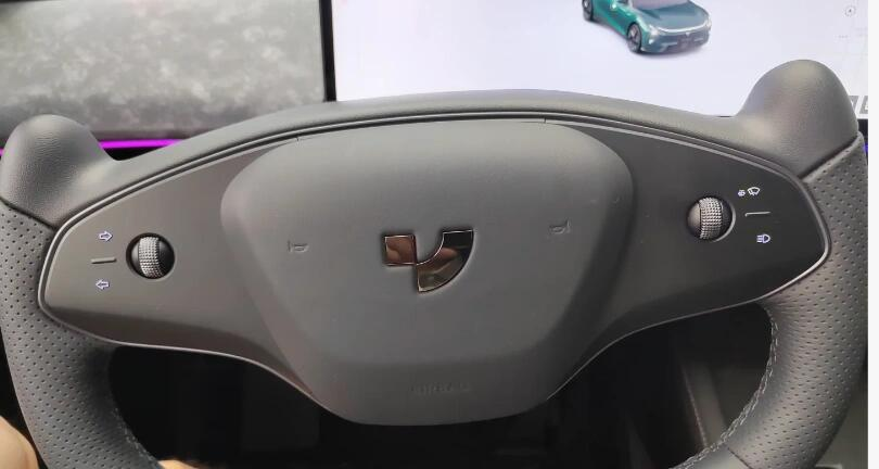 极越07采用当下流行的智能表面的交互方式。方向盘采用了滚轮+按键的极简方向盘按键的风格。按键包括:左转向,右转向,雨刷,灯光等开关。