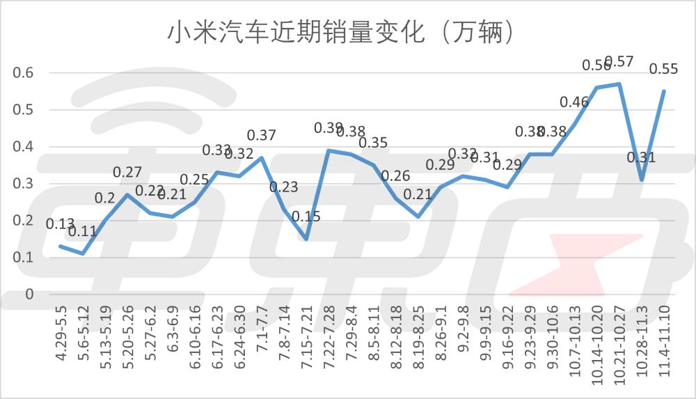而从目前的数据来看,小米汽车在11.4-11.10期间周销量为5500辆,较前一周增加2400辆,增长约77.42%,排名也从第八位上升到了第六位。