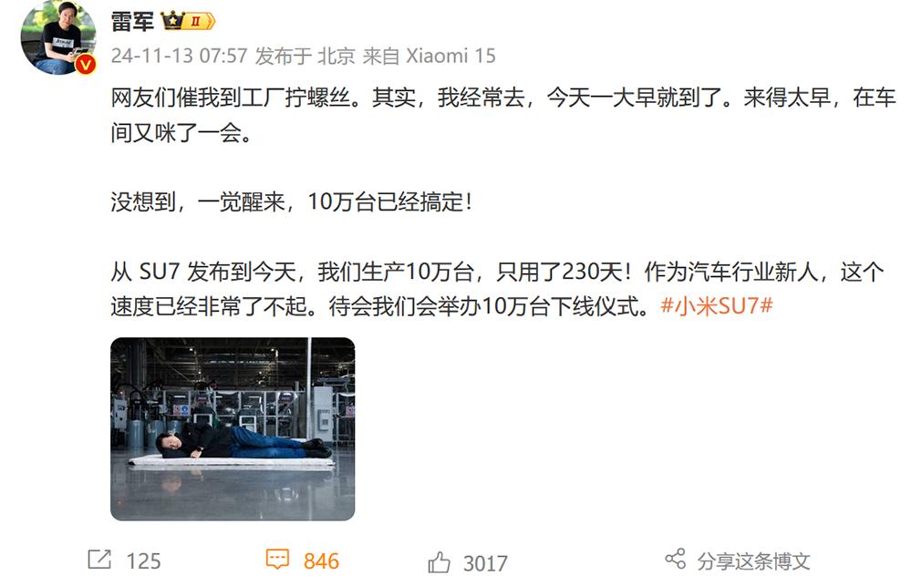 雷军大清早车间打盹,10万台新车下线一觉搞定。