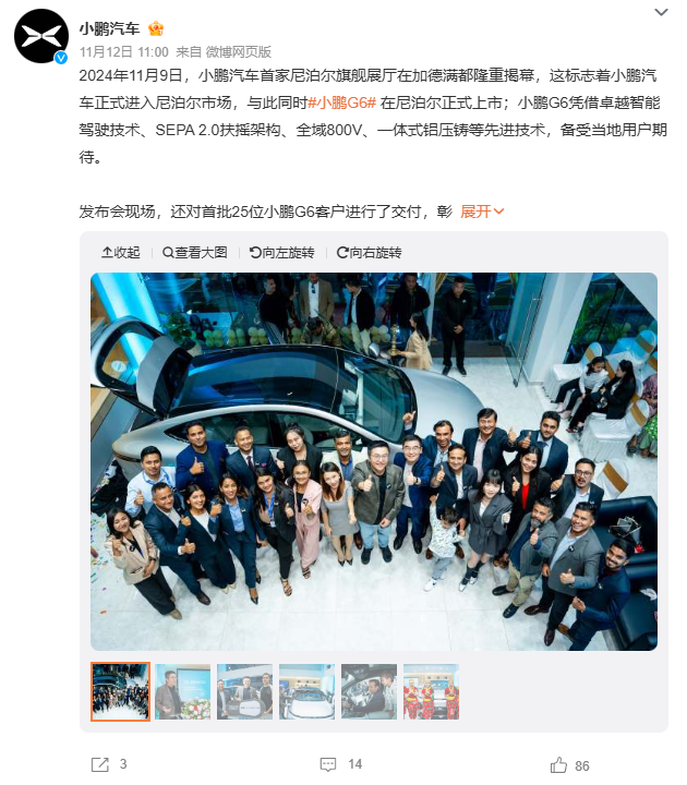 加德满都旗舰展厅的开业不仅标志着小鹏汽车正式踏入尼泊尔市场,还意味着小鹏 G6 已经在尼泊尔正式上市并开启交付。