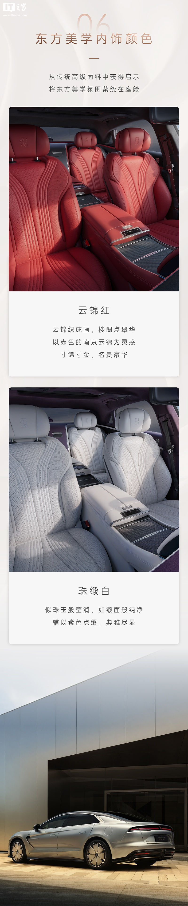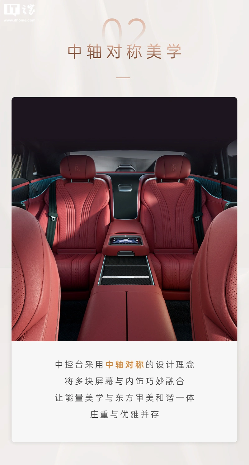 该车将提供 4 座布局,配备前后排贯通的扶手,带来云锦红、珠缎白两种“东方美学”可选内饰配色。