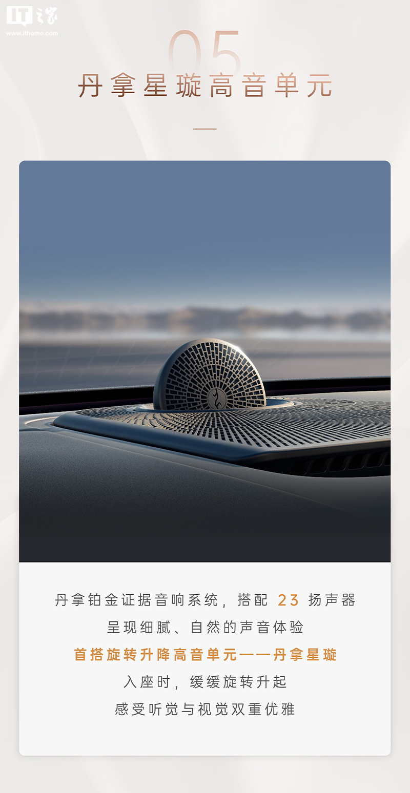 同时,该车配备丹拿铂金证据音响系统,包含 23 个扬声器,首搭旋转升降高音单元 —— 丹拿星璇,入座后该部位将缓缓旋转升起。