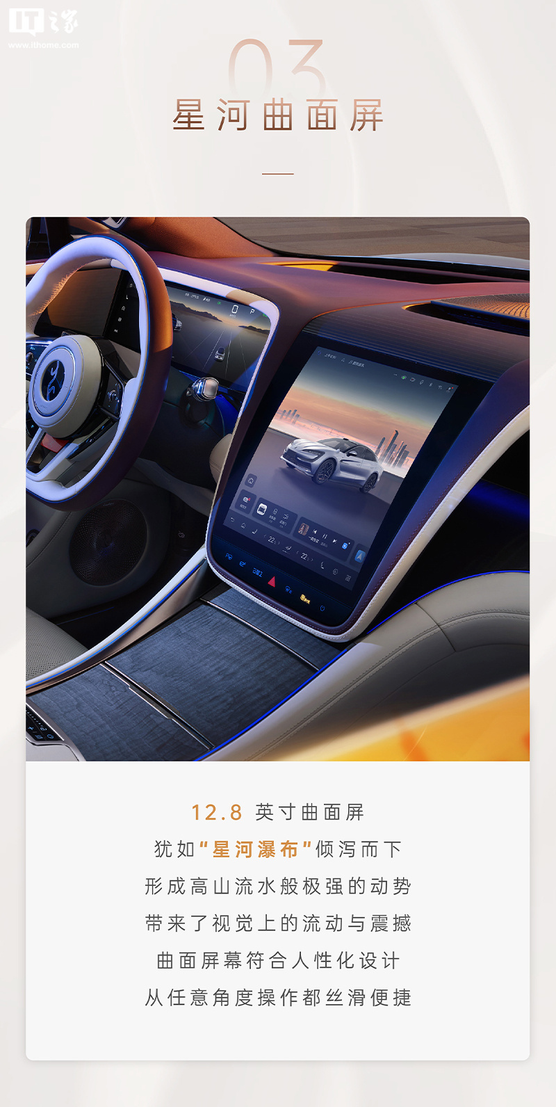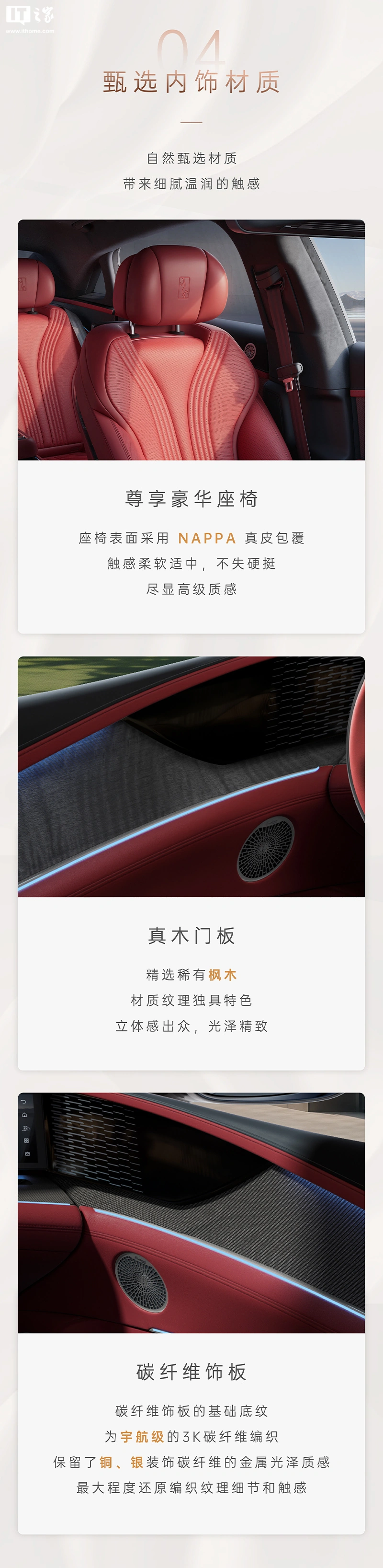据介绍,新车内饰采用沉浸式环绕设计,造型线条形成 360° 全舱环绕的曲线,中控台则采用了“中轴对称”的设计理念,将多块屏幕与内饰巧妙融合。其中央配备 12.8 英寸“星河曲面屏”,座椅表面采用 NAPPA 真皮包覆,车门上配备了材质为稀有枫木的门板和“宇航级”碳纤维饰板。