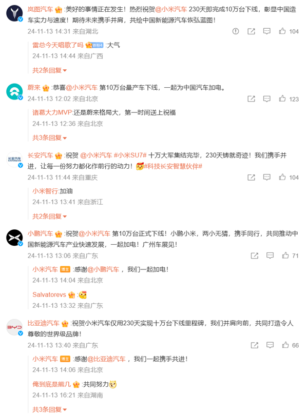 对于小米汽车达成的这一成就,国产车企也组团送上了祝贺。
